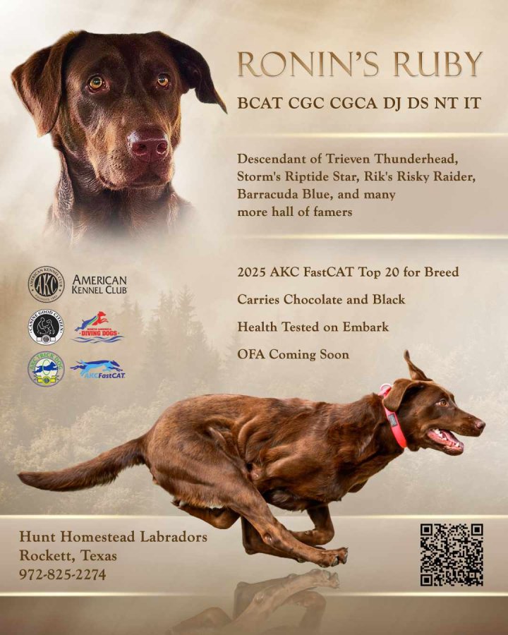 Ruby is ranked AKC 2025's top 20 fastest for breed. She won her first title at only 6 months of age and participates in Dock diving, FastCAT, agility, trick, and obedience. Ruby can also mark and retrieve.